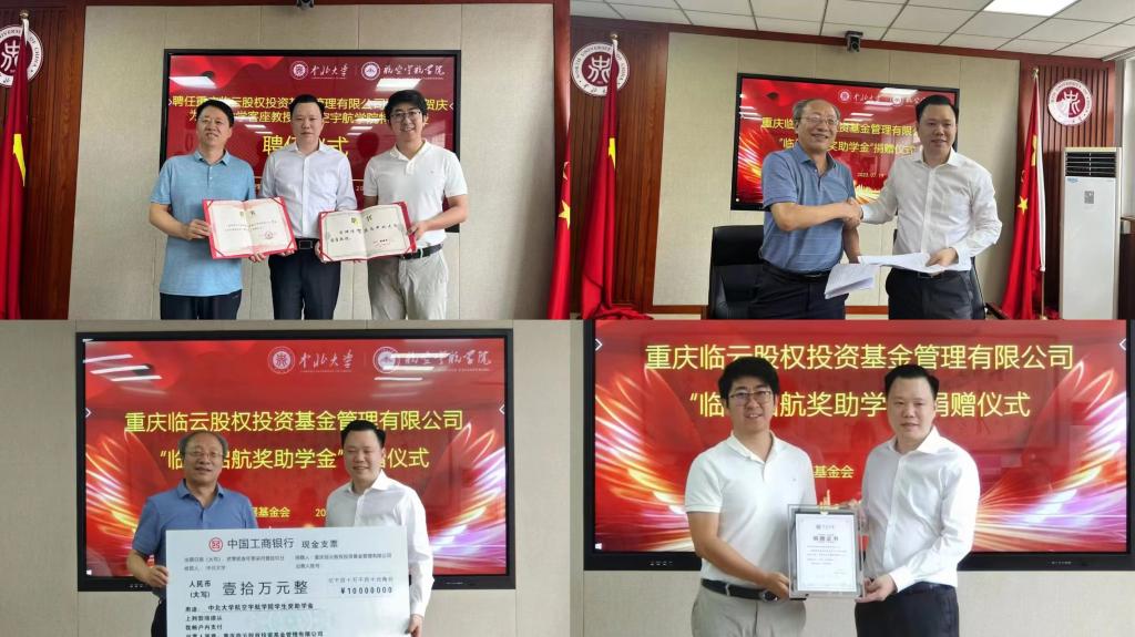 特聘教授聘书。正值学院建院一周年之际,学院还举行了重庆临云股权投资基金管理有限公司“临云启航奖助学金”捐赠仪式,此次共捐赠10万元人民币,用于奖励和资助学院品学兼优及家庭经济困难学生,这是学院建院以来获得的第一笔捐赠款。教育发展基金会理事长薛实军与重庆临云股权投资基金管理有限公司董事长贺庆签署捐赠协议,并颁发捐赠证书。