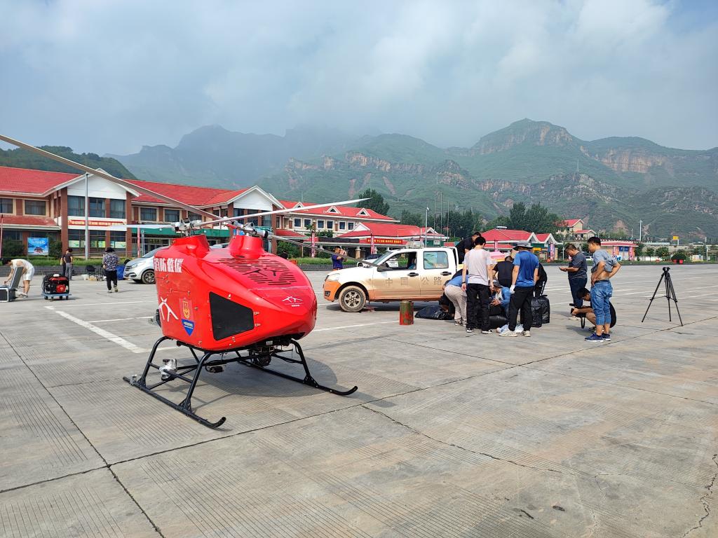 产学研项目JZ-550无人直升机挂载救援物资从野三坡服务区起飞,快速飞向涞水县受灾点,抵达目标区域上空后,通过绳索将食品、药品、鸡蛋、饮用水、汽油和发电机等救援物资空中精准投送,本次救援共计往返灾区9次,持续作业总时长达8小时,空投救援物资近1000斤,克服了山区恶劣环境,快速高效地完成了救援物资的投送任务,为本次抢险救灾工作提供了有力的航空技术支撑和能力保障。有效解决了老人、孕妇、婴幼儿在内总计200多人急需物资与生活保障。